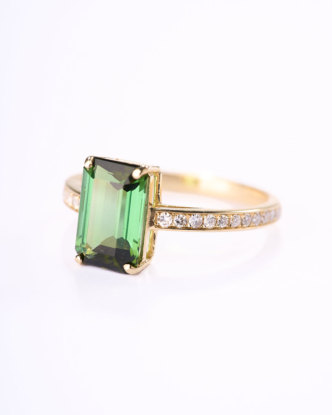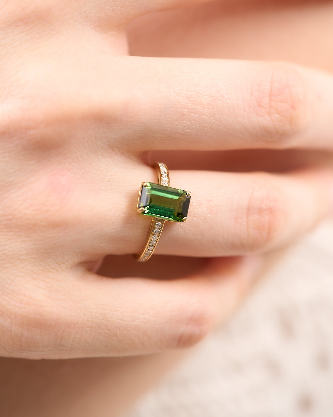 L’anello Orphèè colpisce per il verde profondo della tormalina taglio smeraldo, protagonista elegante e decisa. Realizzato in oro giallo 18 carati, è completato da una fila di diamanti lungo il gambo, che aggiunge una luminosità sottile e continua. La montatura slanciata valorizza la pietra centrale con linee pulite e un equilibrio raffinato. Un gioiello artigianale dal carattere contemporaneo, perfetto per chi ama un colore distintivo e prezioso.